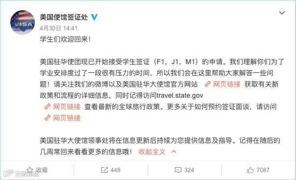 4月30日,官方宣布:美驻华使馆5月4日恢复学生签证申请!
