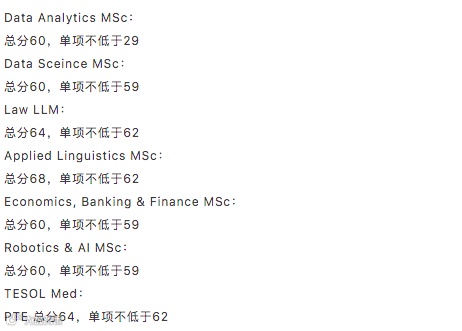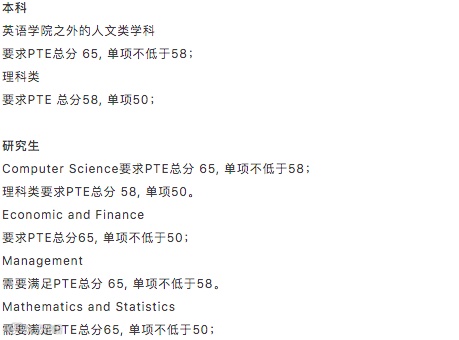 人文、商科、牙科、教育、健康科学、医学、公共政策、社会科学:PTE各单项不低于59。