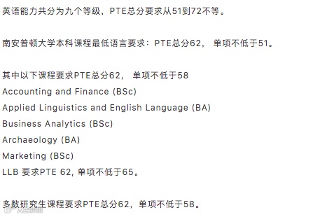 授课型硕士研究生课程最低PTE语言要求:总分不低于64, 各单项不低于60。