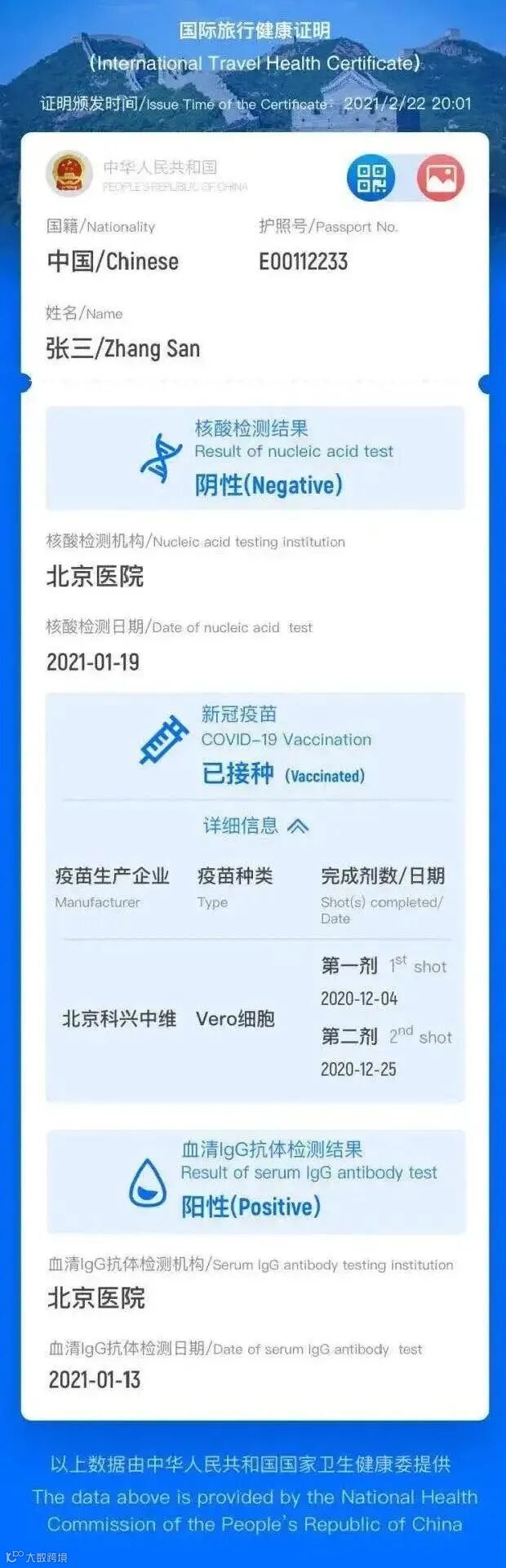 3月8日,中国版“国际旅行健康证明”微信小程序已正式上线。中国版“国际旅行健康证明”是一种综合性证明,展示持有人的核酸、血清IgG抗体检测结果及疫苗接种情况等。健康证明内含加密二维码,以供各国相关部门验证并读取个人相关信息。除电子化展示外,还可以打印生成纸质版。