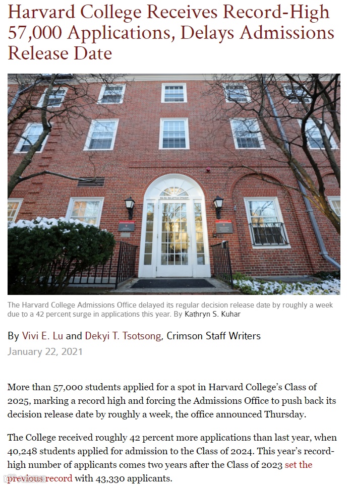 哈佛大学招生办公室上周四宣布,超过5.7万名学生在今年申请了哈佛大学!创下了历史新高同时,也迫使招生办公室将公布决定的日期推迟了大约一周。