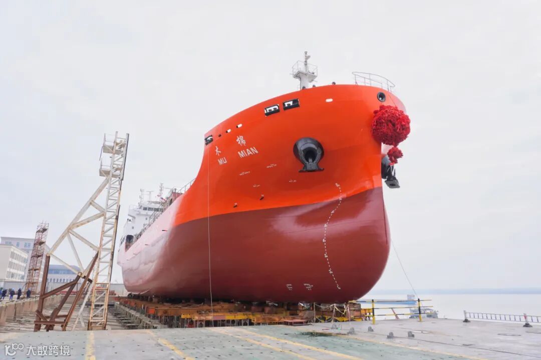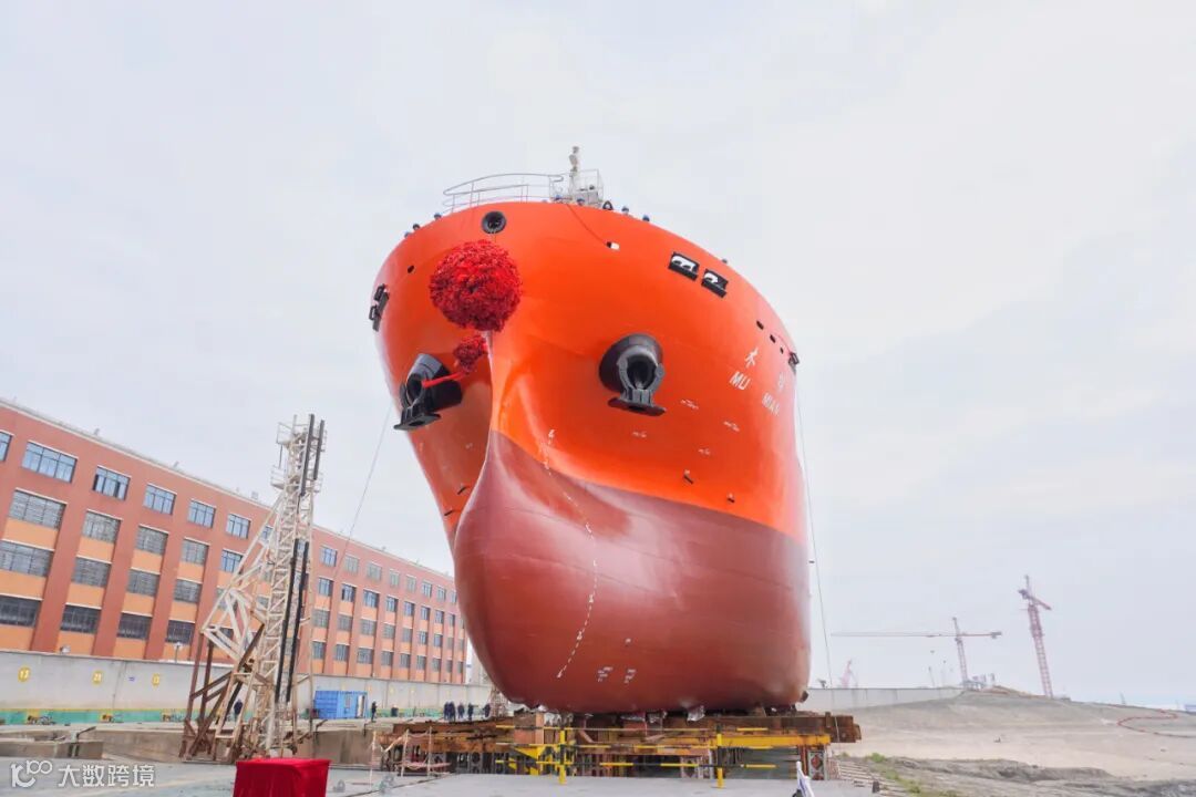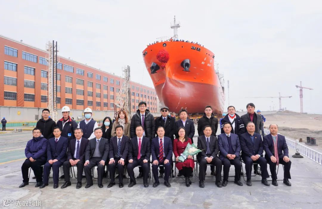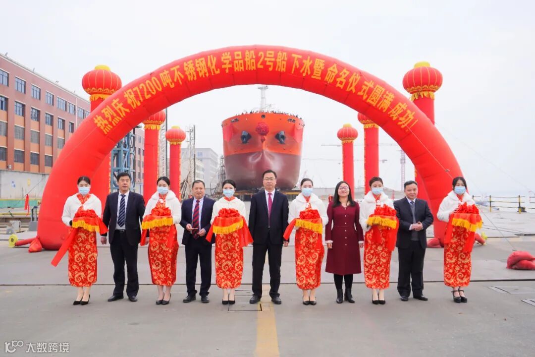 上海君正物流有限公司常务副总经理吴贵荣,上海君正物流有限公司副总经理关霞,上海船舶研究设计院总工程师王刚毅,中国船级社武汉分社副总经理杜海根,武船集团副总经理田军,为7200吨不锈钢化学品船2号船下水剪彩。