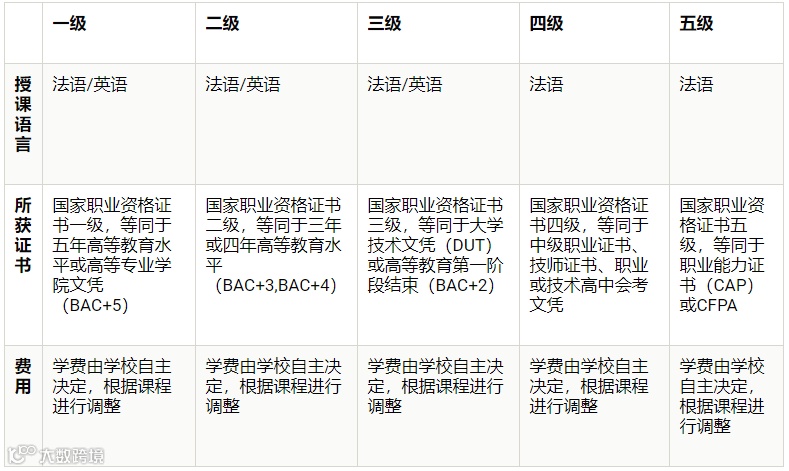 也就是说,RNCP不是一个文凭,只是一个对课程的认证。在此之前,目录中的证书被划分为五级。如下图所示: