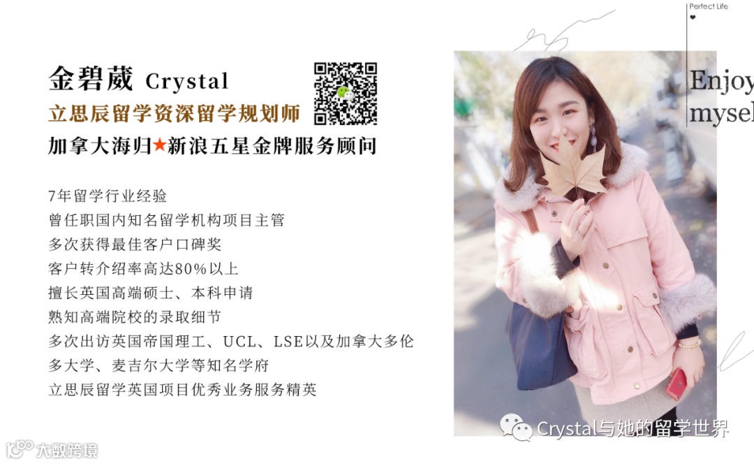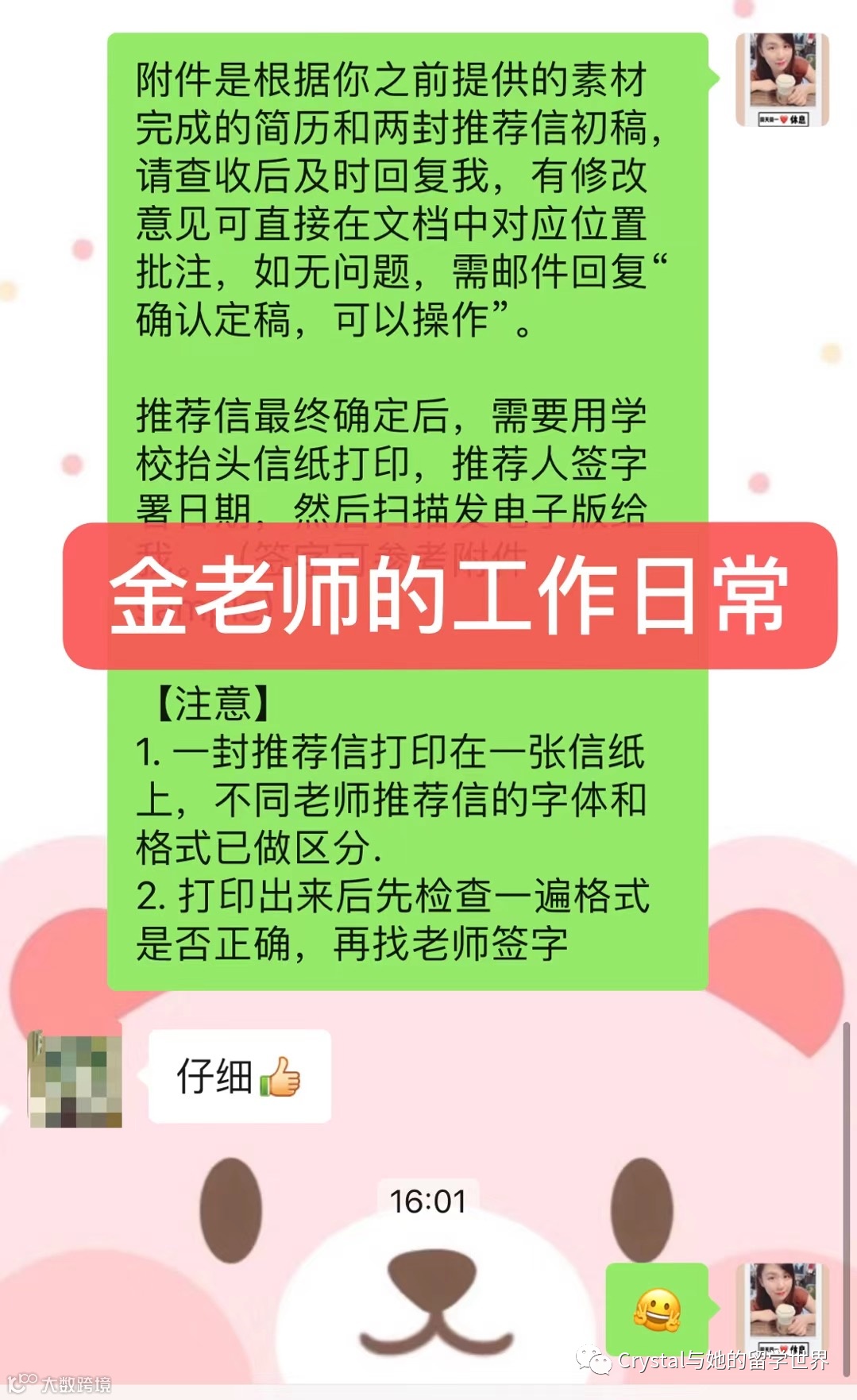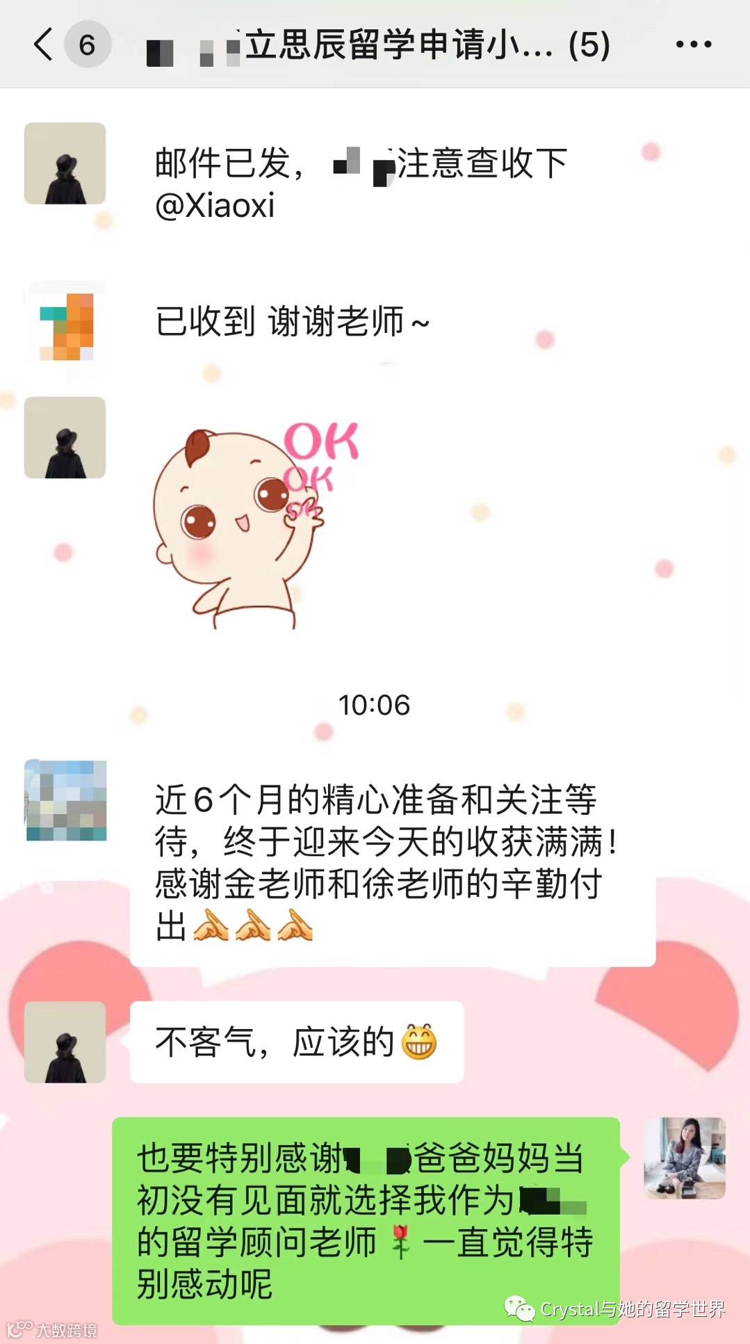 金老师给我们指明了方向后,我们经常会微信交流,她给了我很多的鼓励和支持让我不会那么的焦虑了。我在她的指导下有条不紊的准备申请的材料还有文书,我的文书老师徐晓青老师也非常的专业负责,文书反复斟酌调整后才递交的英国大学的申请。