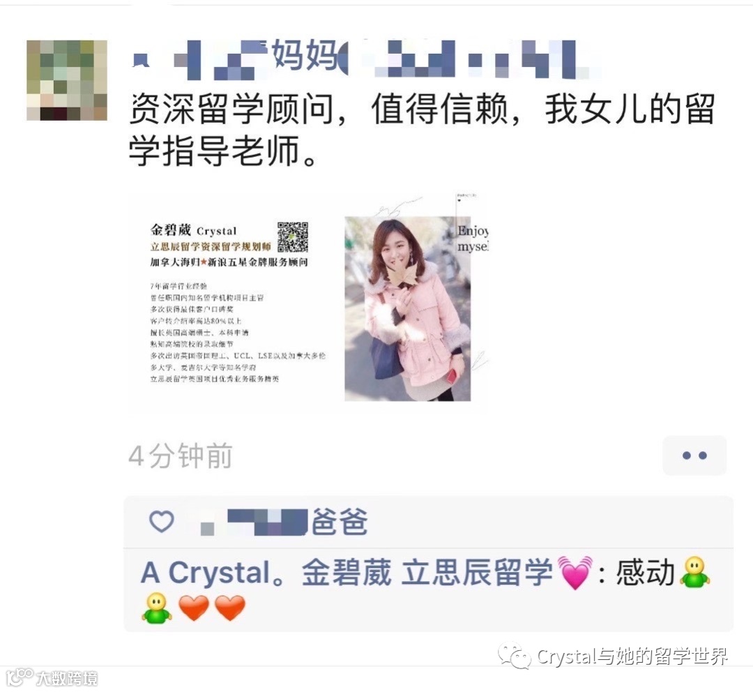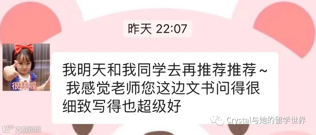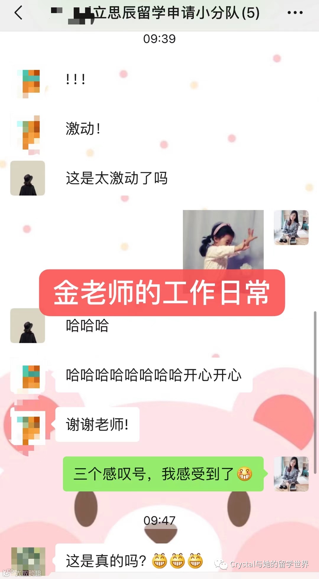 后面妈妈思前想后在某个深夜微信联系了立思辰留学的金碧葳老师,因为她一直有默默关注金老师的朋友圈,也感受到金老师对每个学生都非常的负责,很多事情都会站在学生和家长的角度去考虑,并且有很好的口碑,她从来不会像一些留学顾问那样为了业绩去忽悠家长或者过度承诺一些不可能的事情。
