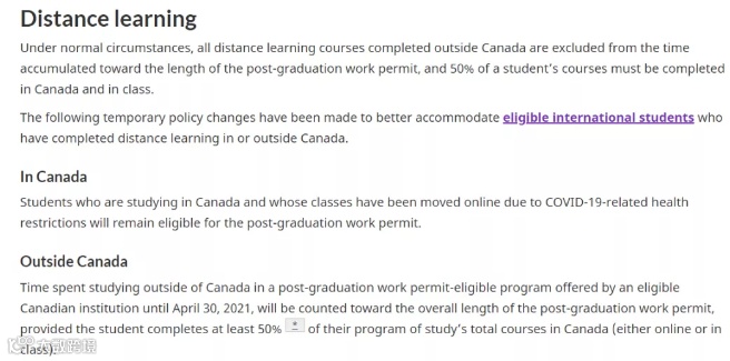 根据移民部官网发布的,国际学生是在2020年的春季、夏季或秋季开始的为期8-12个月的课程,且在加拿大境外完成,但只要是符合毕业工签申请要求的学校,且是全职学生,其毕业后仍有资格申请毕业后工作许可证。