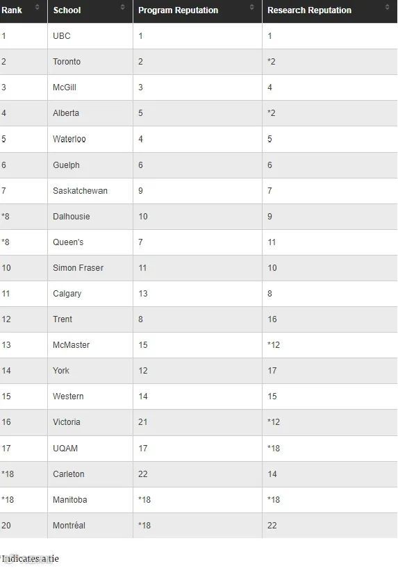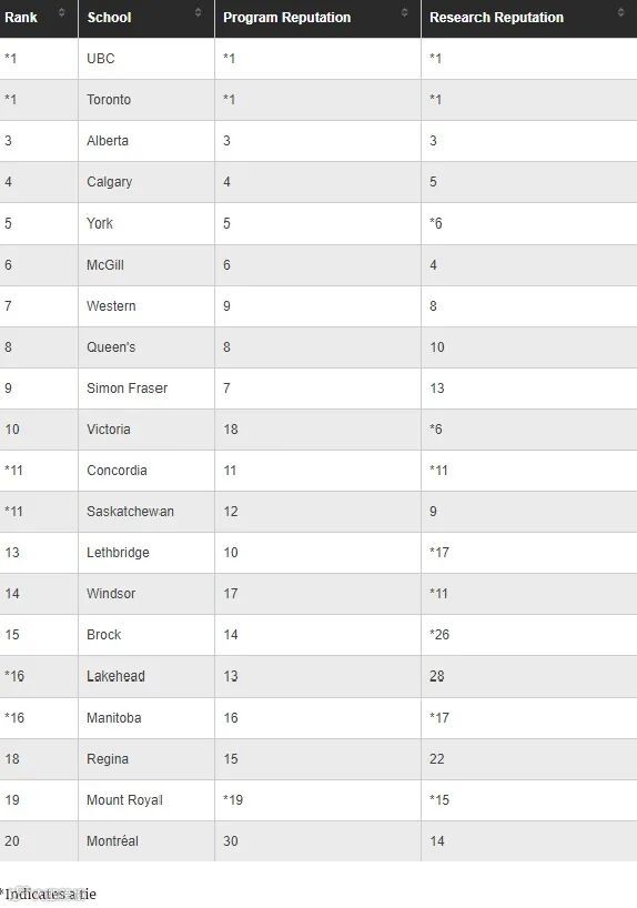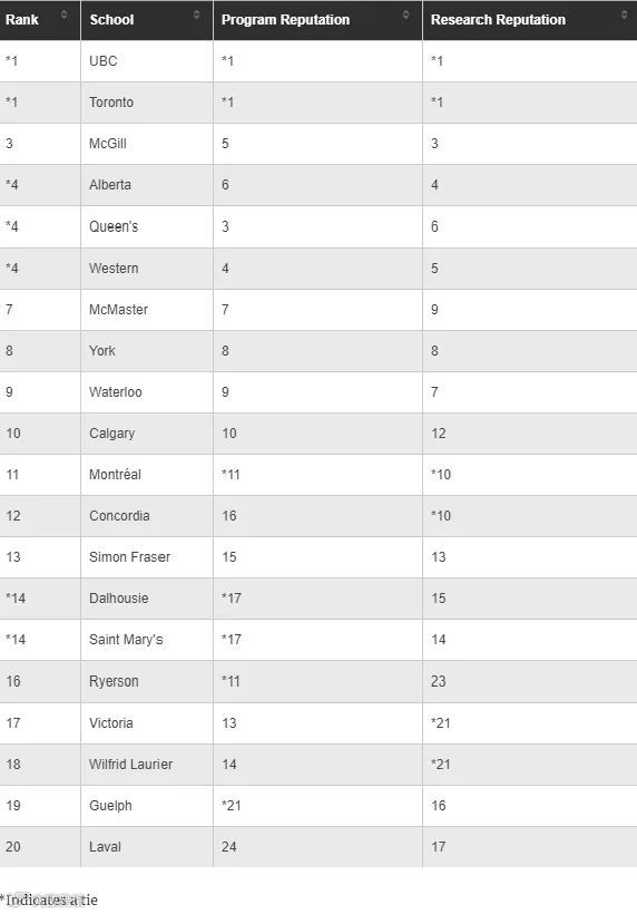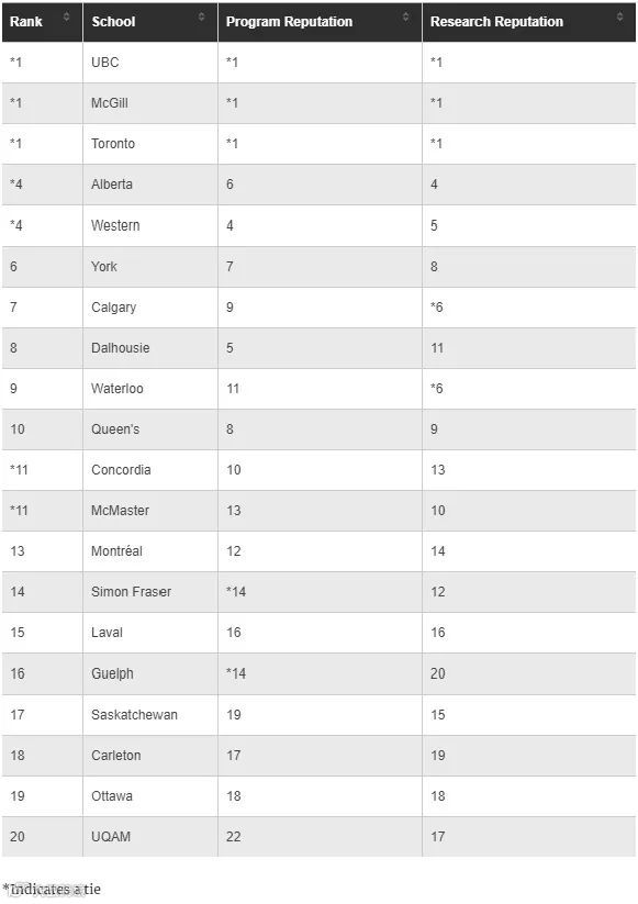 在此次排名中,UBC大学、麦吉尔大学和多伦多大学并列第1位,阿尔伯塔大学和西安大略大学排在第4位,约克大学并列第6位。
