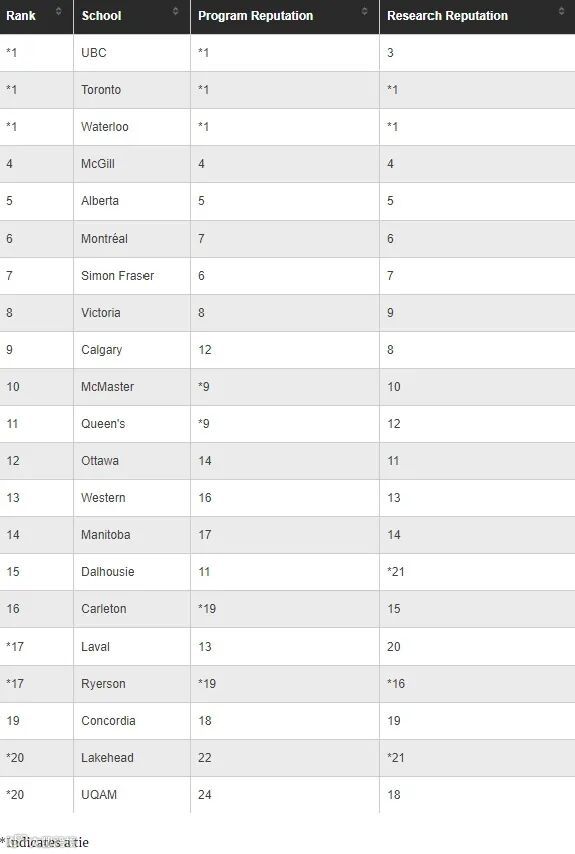 在此次排名中,UBC大学、多伦多大学和滑铁卢大学并列第1位,麦吉尔排在第4位,阿尔伯塔大学第5位。