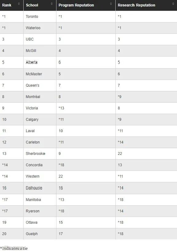 在此次排名中,多伦多大学和滑铁卢大学并列第1位,UBC大学在第3位,麦吉尔大学第4位。
