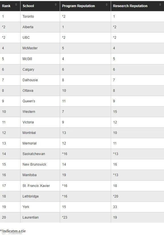在此次排名中,多伦多大学排在第1位,阿尔伯塔大学和UBC大学并列第2位,麦克麦马斯特在第4位。