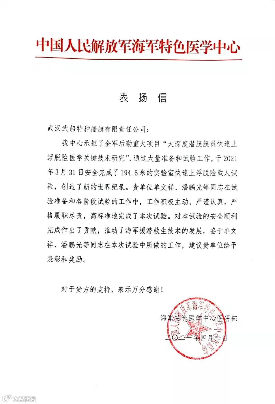 据国际权威机构公开透露,此前快速上浮脱险世界纪录是英国皇家海军创造的190.6米。此次194.6米快速上浮脱险试验任务的顺利完成,不仅解决了我国大深度快速上浮脱险相关技术难题,而且取得了大量技术参数,为新型援潜救生装备研制和作战保障能力提升奠定了基础。
