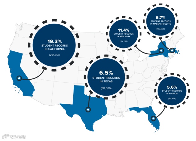 留学生最喜欢的州:加州、纽约州、马塞诸塞州、德克萨斯州和佛罗里达州;其中,加州在2019年接收了294657名留学生,比例高达19.3%。