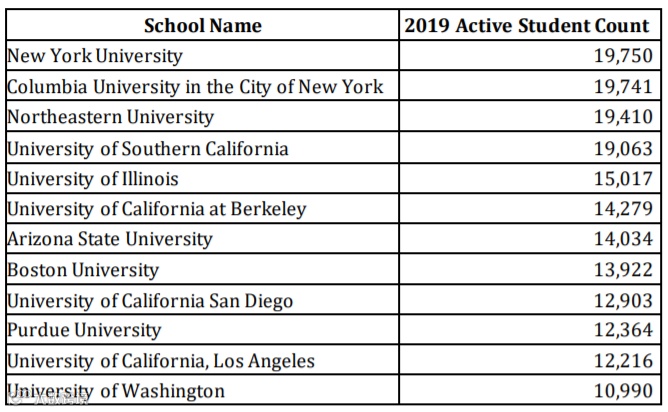 纽约大学(19,750人), 哥伦比亚大学(19,741人), 东北大学(19,410人), 南加大(19,063人),伊利诺伊香槟分校(15,017人)为接收留学生最多的大学;