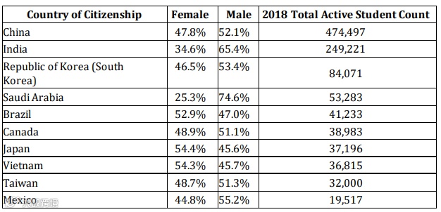 在474,497名中国留学生中,男生和女生的比例分别为52.1%和47.8%。在十大生源国中,仅巴西和越南的女生人数超过了男生。