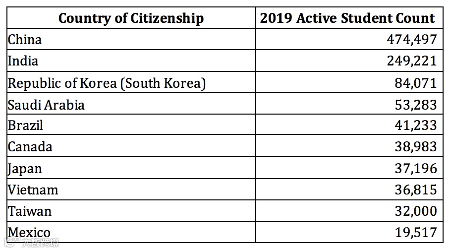 在这152万多留学生中,留学生人数排前三的国家分别是中国、印度和韩国。其中有47.4万多人来自中国,中国留学生人数占2019学年美国总留学生人数的三分之一,是排名第十墨西哥留学生人数的24倍。