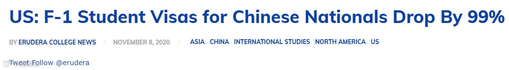 就中国而言,11月4日,根据《日经亚洲》援引美国国务院的数据显示,在2020年4-9月之间,美国一共向中国学生发放808份签证,而在2019年同期发放了90,410份,中国公民的F-1学生签证数量下降了99%!