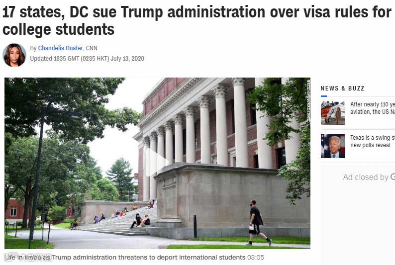 截止到7月13日,已经有共计17个州以及首都华盛顿哥伦比亚特区向位于马萨诸塞州波士顿的联邦地区法院提起诉讼,要求撤回最新出台的针对国际学生的规定。