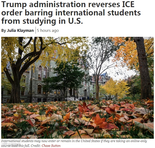在社会各界的强烈反对下,当天,在开庭审理哈佛大学和麻省理工学院对美国联邦政府提起的诉讼时宣布,美国国土安全部及其下属的入境和海关执法局同意撤销一项禁止国际学生在美国学习网课的签证政策。