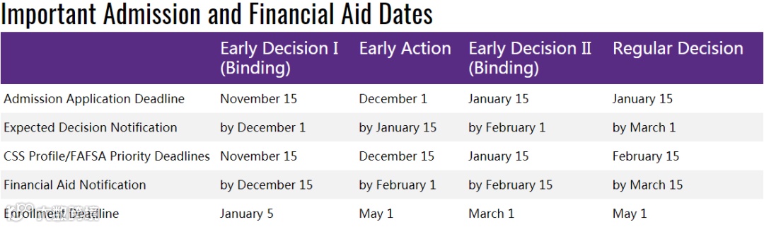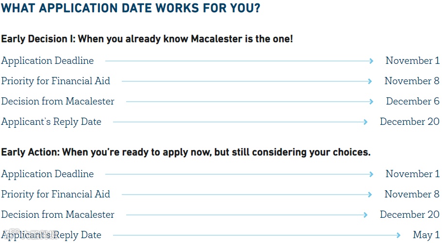玛卡莱斯特学院是一所坐落在明尼阿波利斯—圣保罗双城都市圈的私立文理学院,在 USnews 文理学院排名25,今年新增 EA 早申批次。申请截止日期为11月1日,通知日期在12月20日。其他申请方式及相关日期如下: