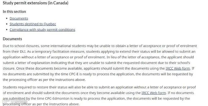 作为一项临时便利措施,移民部可以允许学生在续签时在没有录取通知书或入学证明的情况下提交申请。在提交申请时,申请人须通过移民部的Web Form提交一份解释信,注明因学校关闭而无法提交所要求的文件。申请人应该使用IRCC Web表单提交这些文件。如果申请人没有提交任何文件,移民部将按照上述指示要求申请人提交文件。