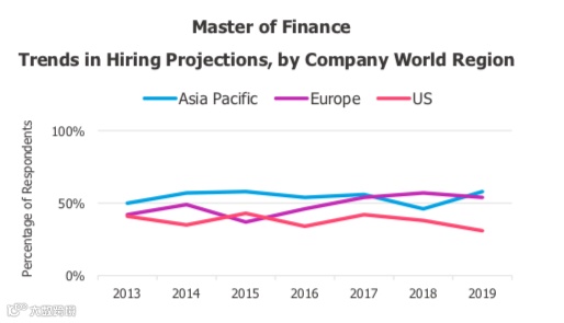 大多数欧洲(54%)和亚太(58%)的公司今年计划招聘金融硕士毕业生,而只有不到三分之一的美国雇主计划招聘这类毕业生(31%)。
