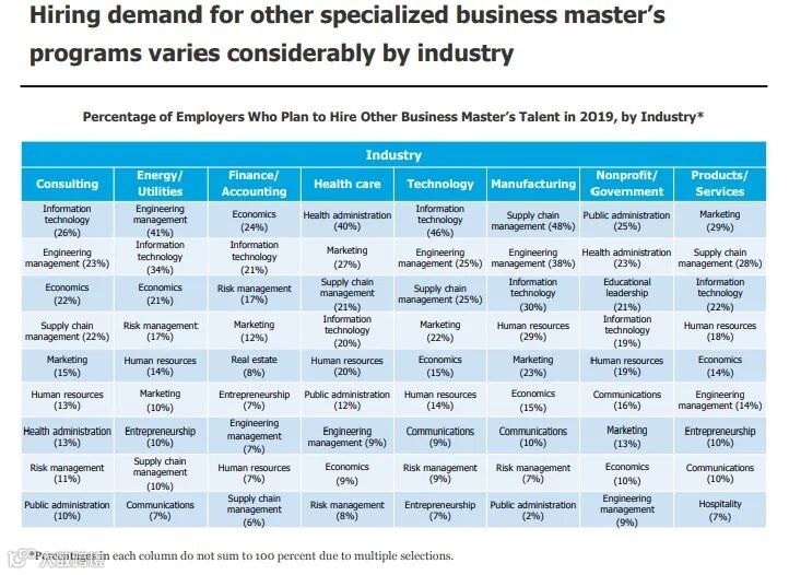 在最新发布的2019年年度商学院雇主调查报告中,调查了超过1200名企业招聘人员,主要内容包括:各项专业硕士的就业前景、就业趋势、行业需求和各个地区的需求等。