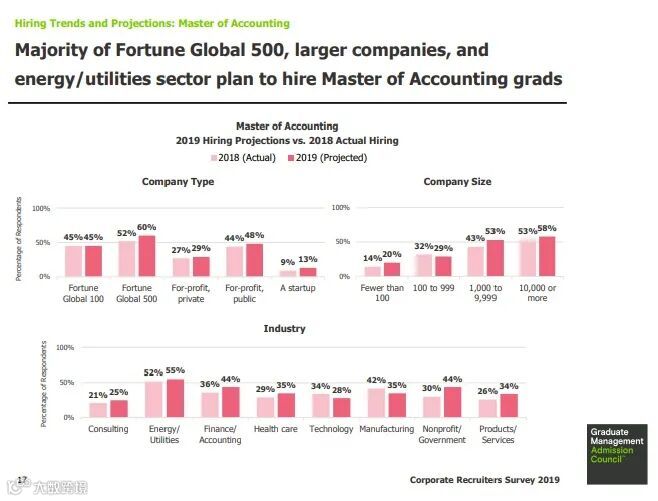 50%的亚太公司、43%的欧洲公司和32%的美国公司计划在2019年聘用刚毕业的会计硕士毕业生。