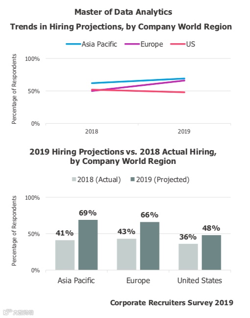 报告中显示,亚太和欧洲雇主对精通数据分析人才的招聘需求最强,每个地区都约有三分之二的公司计划从这批2019年的毕业生中招聘。在美国方面,对精通数据分析的人才也有很大的需求,48%美国雇主计划招聘数据分析硕士。