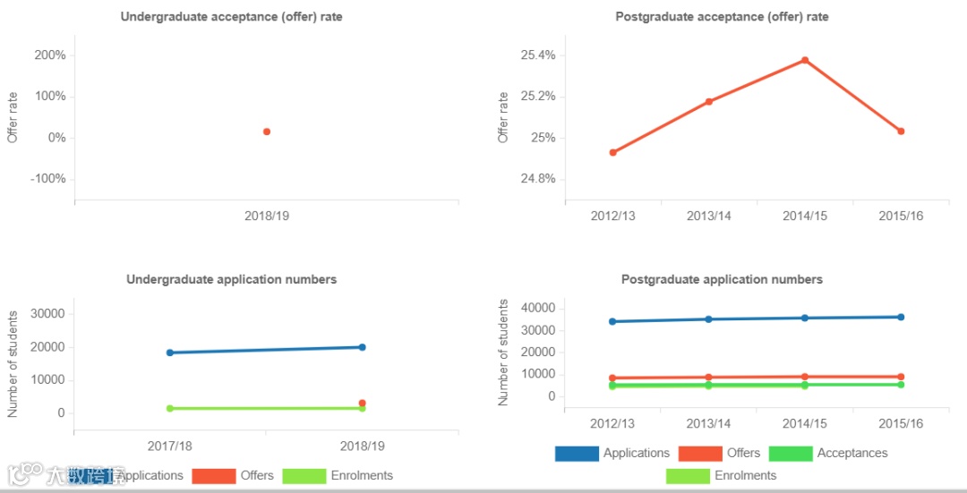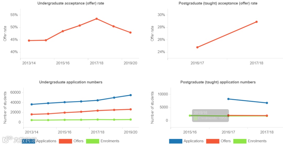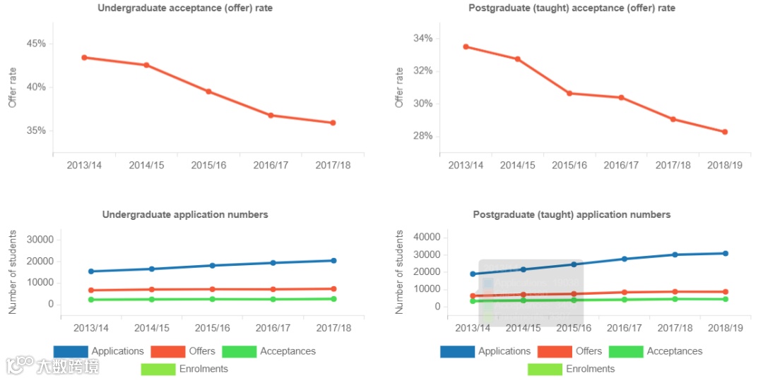 从近年来录取率的走势图可以看出,伦敦大学学院的本科和研究生的录取率是有呈上升趋势的,同学们也别忽略了伦敦大学学院申请量的增长。
