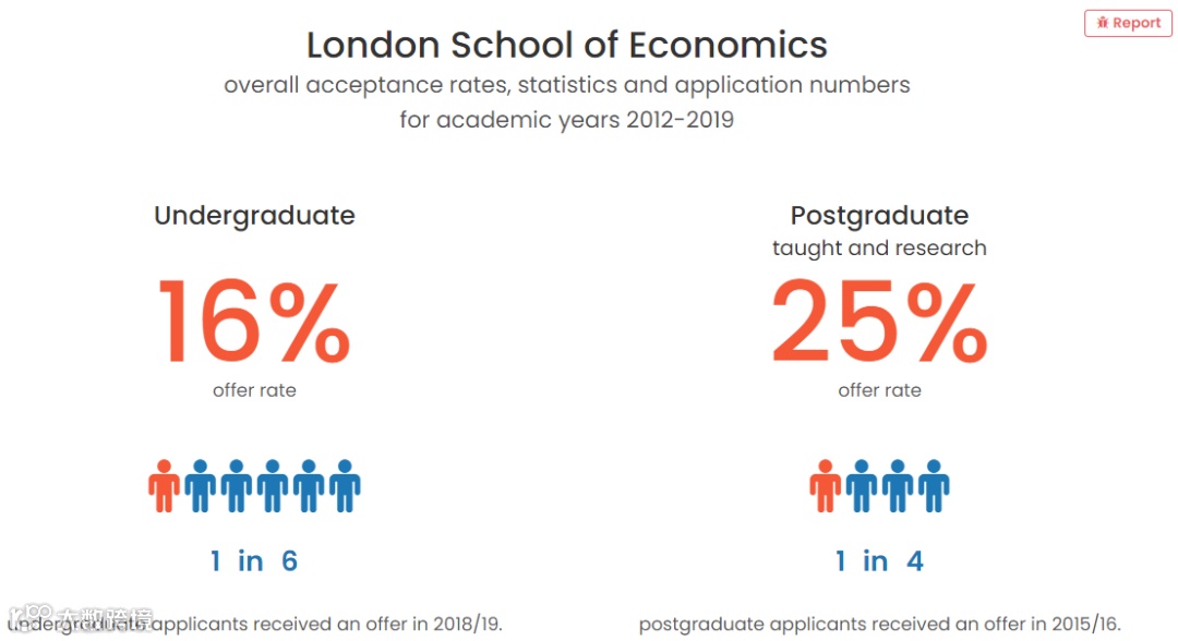 伦敦政治经济学院在2018/19入学季的本科录取率为16%,2015/16入学季的研究生录取率为25%。