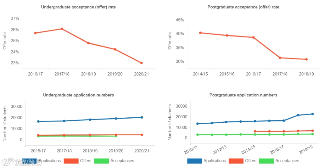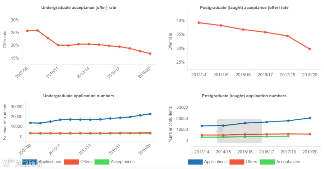 从2007-2020年的趋势图可以看出,牛津大学的本科和研究生的申请人数呈上升趋势,录取率都是呈下降趋势的。