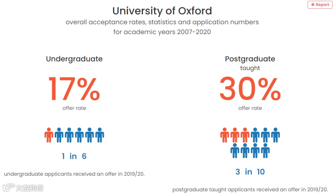 2019/20入学季,牛津大学的本科录取率为17%,研究生录取率为30%。