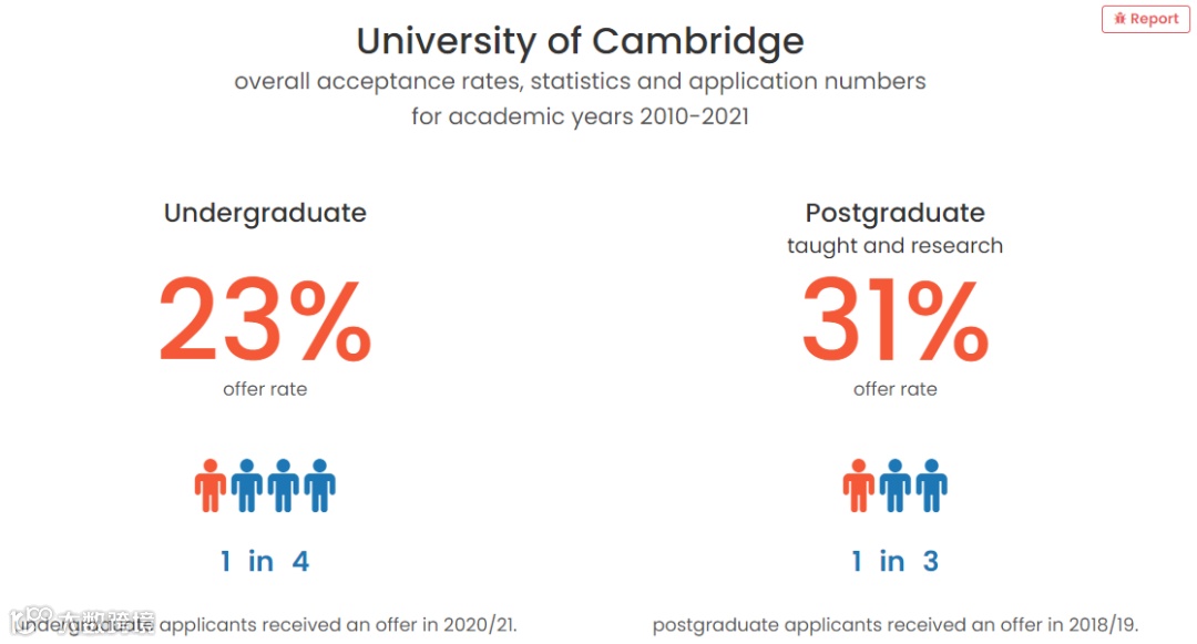 2020/21入学季,剑桥大学的本科录取率为23%。2018/19入学季,研究生录取率为31%。