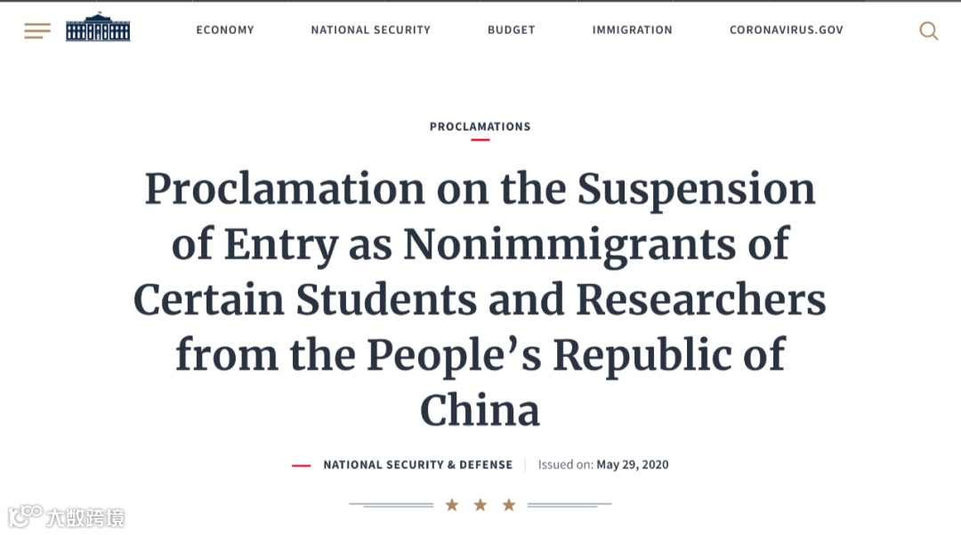 美国白宫公告:6月1日起禁止部分中国留学生和研究人员入境。