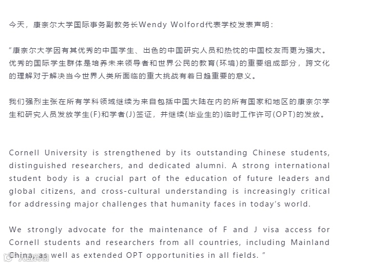 川普的行动也受到美国各界的反对,对此,中国留学生比例占20%的康奈尔立即发表声明,表示了反对。