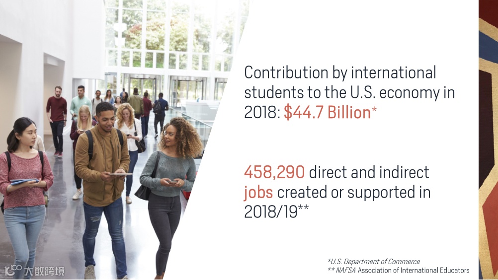 根据 2019 美国门户开放报告 Open Doors 数据数据显示,仅2018-2019学年,国际生就为美国大学贡献了 447 亿美元的学费。