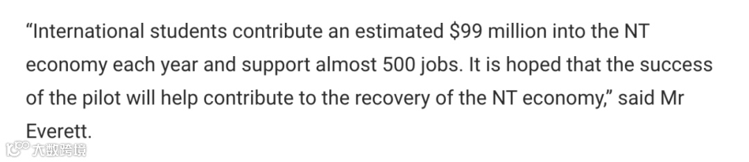 “国际学生每年为北领地经济贡献约9900万澳元,并提供近500个工作岗位。希望这次试点计划的成功将有助于北领地经济的复苏。”埃弗里特先生说。