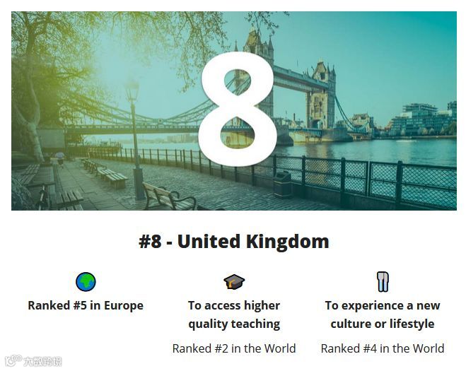 另外,在“体验新的文化或生活方式”这一因素上,英国排名第四。从下午茶到酒吧,从城堡到高地,从香肠土豆泥到炸鱼薯条,留学生们在学习之余,还能够享受令人兴奋的学生生活。