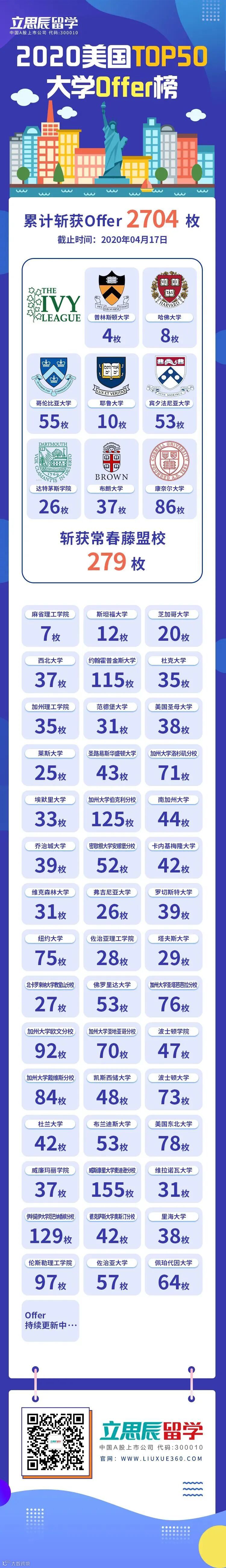 截至4月17日,立思辰留学美国共斩获全美TOP50录取2704枚,其中本科录取811枚offer,研究生录取1893枚,其中不乏普林斯顿大学、哈佛大学、耶鲁大学、麻省理工大学、斯坦福大学、宾夕法尼亚大学等顶尖名校录取。