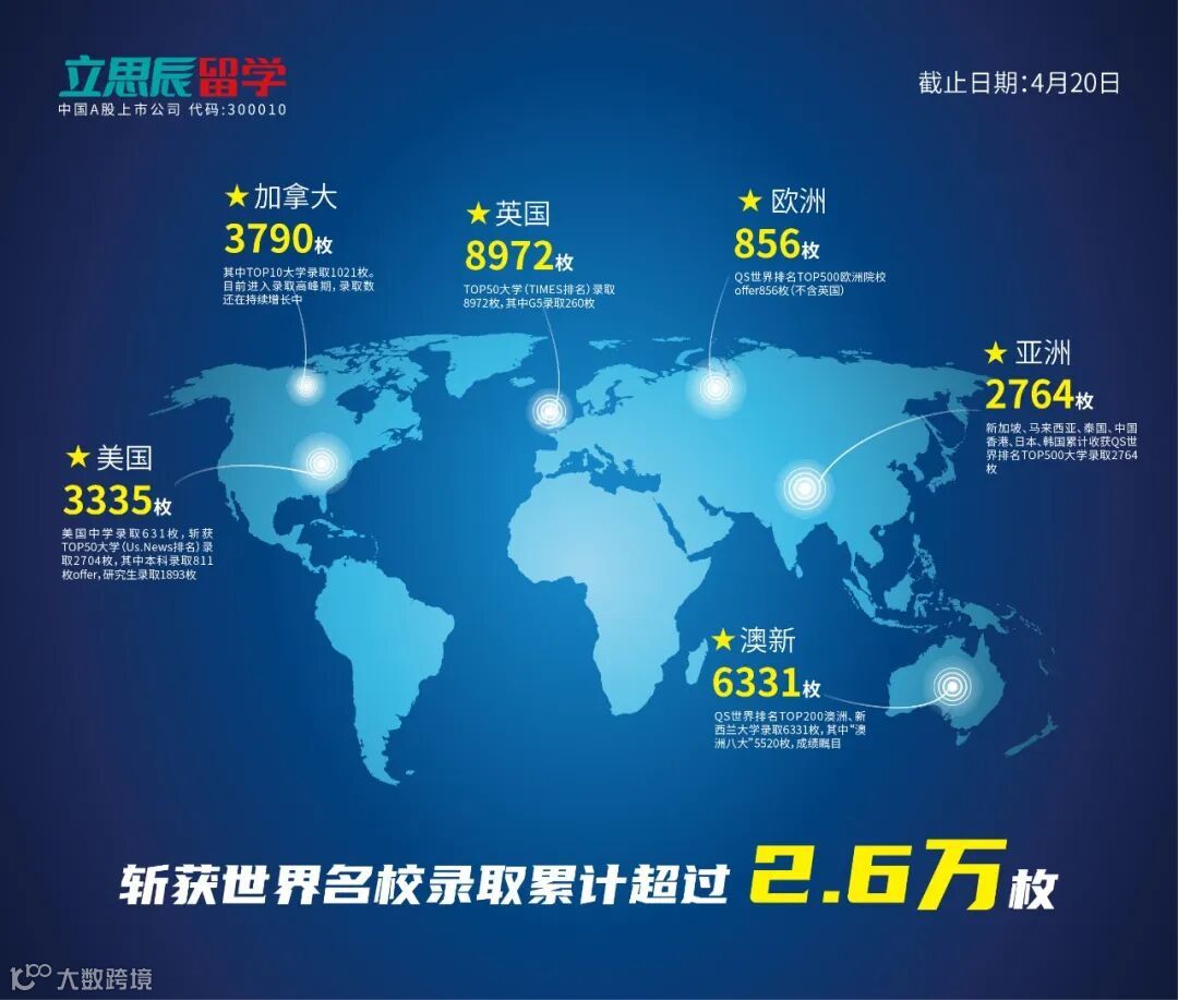疫情终会过去,生活还是会回归正轨,考试和申请都还是要继续,截止4月20日,立思辰留学斩获世界名校录取累计超过2.6万枚,具体如下: