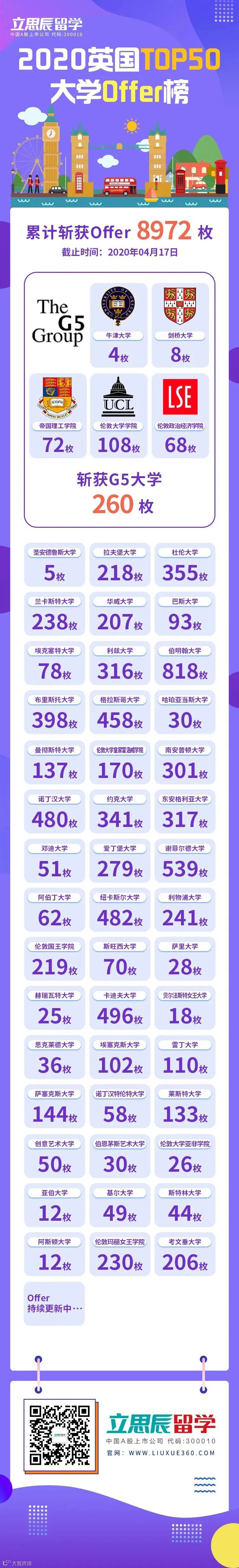 截至4月17日,立思辰留学英国部收获英国Top50大学共8972枚offer,其中G5院校收获260枚offer,可谓成绩斐然!