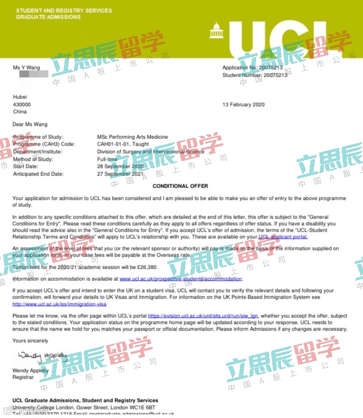 当然王同学还是国家二级运动员,也是武汉体育学院的校学生会副秘书长。这些课外活动,也可以看出王同学有着丰富的课外活动经历,其实这也是现在的英国大学比较看中学生的闪光点。最后申请结果,也算是不负众望的拿到UCL的录取。