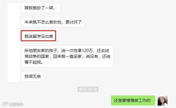 起因是杨酱高三了,成绩不是很好,高考预估在400上下,自己所处的城市,疫情也比较凶猛,在这段时间的学习状态也不好,她很担心高考发挥不好,去到一所大专院校,但是杨酱又不甘心于此。所以多番了解,觉得出国留学或许可以改变读大专的命运,于是就在网上找到了我的联系方式,加上了我的微信。
