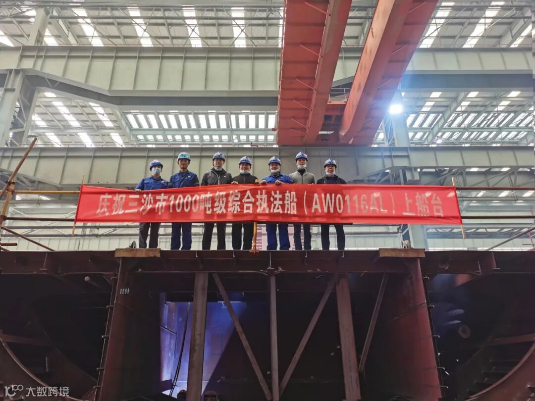 2020年10月19日,中国船舶武船集团承制的三沙市1000吨级综合执法船首制分段顺利上船台。