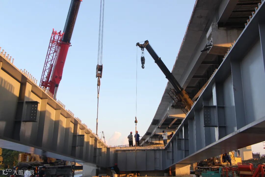 ▲最后一跨钢板梁架设中