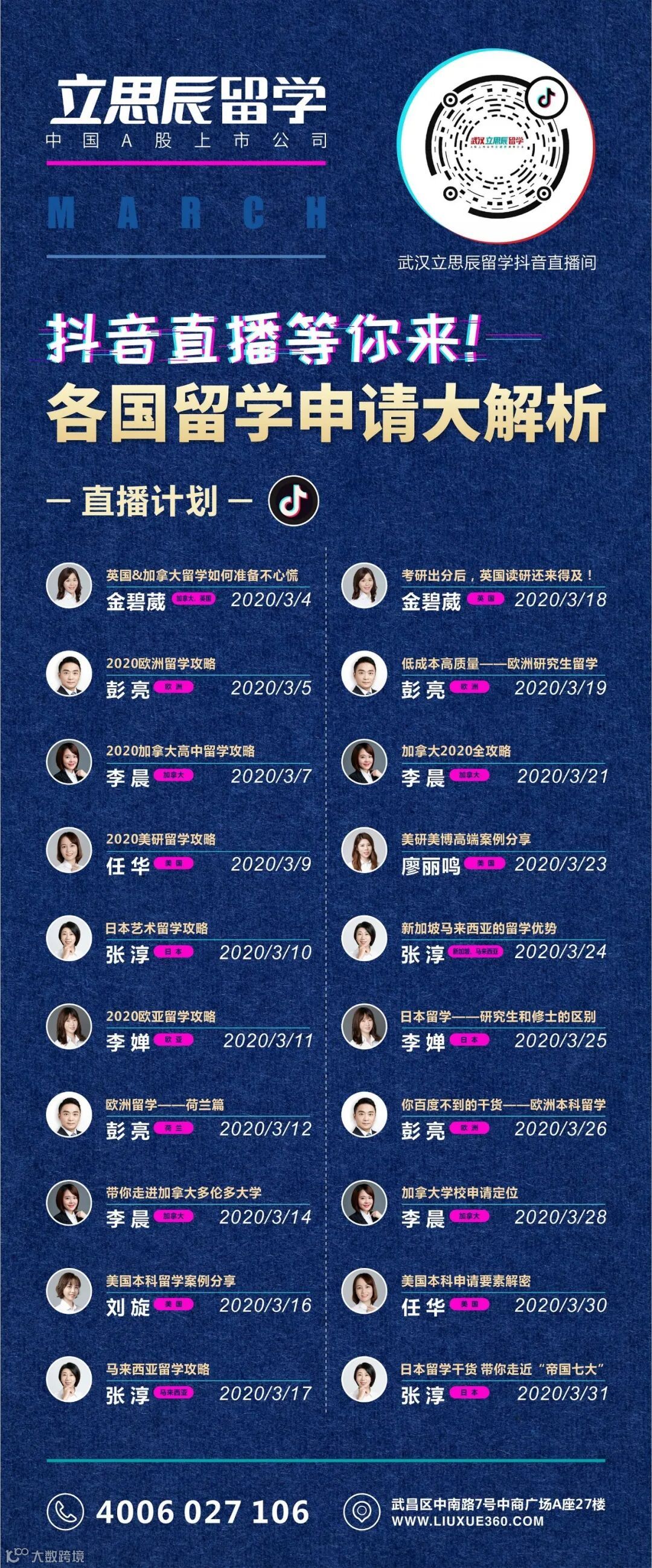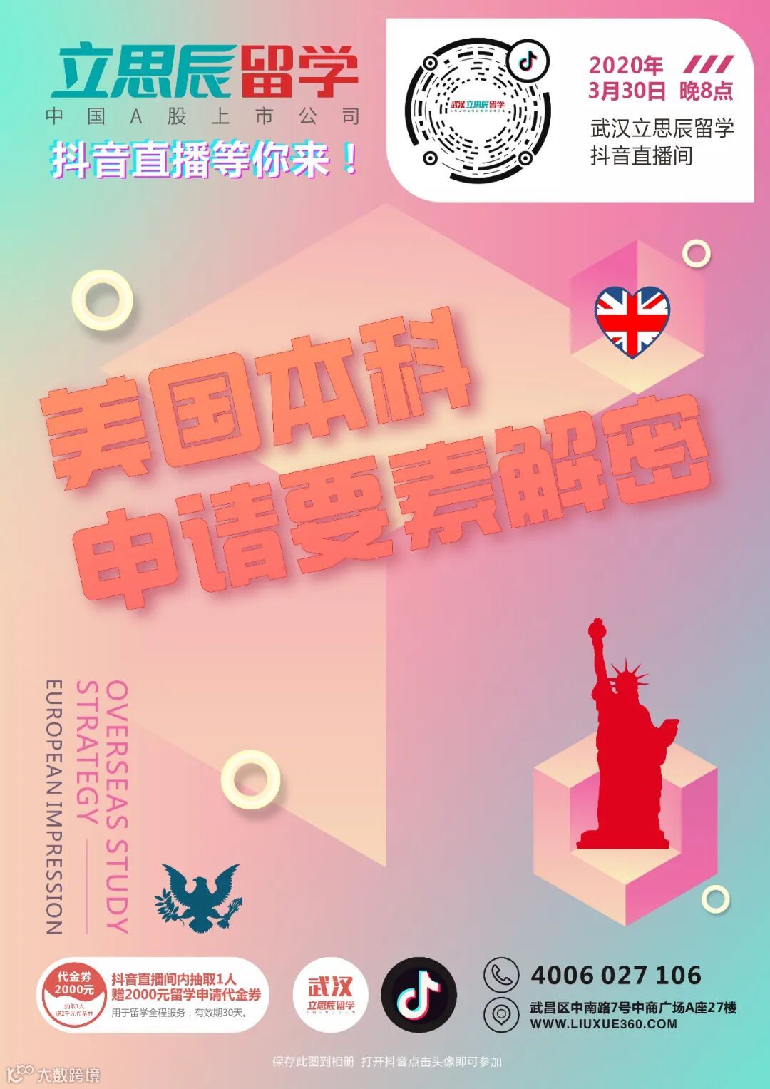 任何一个准备申请美国本科留学的同学,都不应该错过今晚8点的武汉立思辰留学抖音直播间,我们的任华老师将会为你解密美国本科申请要素,让你在申请名校的路上脱颖而出~
