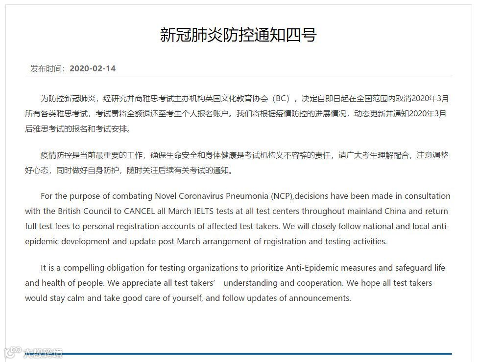 雅思官方通知:取消2020年3月份中国大陆地区雅思考试