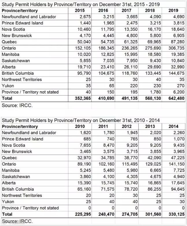 2019年,安省的国际留学生约30.7万人,占加拿大国际留学生总数的48%。BC省排名第二,约有14.5万人,占全国总数的23%。魁北克排名第三,约有8.7万人,占全国总数的14%。曼尼托巴省和新斯科舍省的国际留学生人数,在全省人口中的比例较高,每个省约有1.9万人。