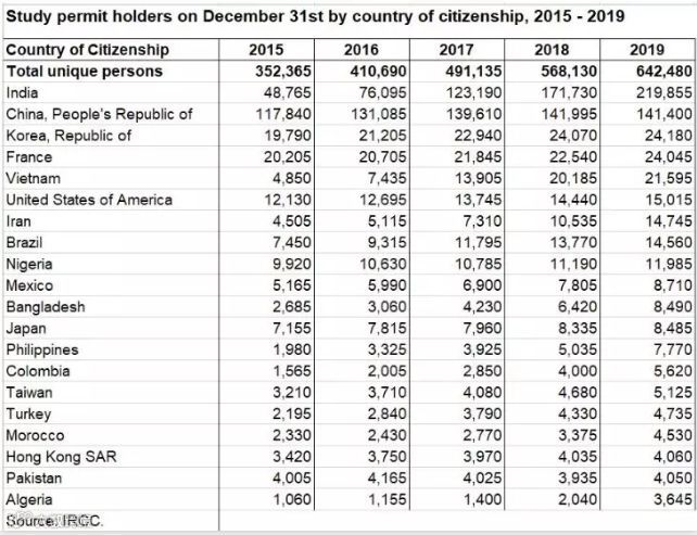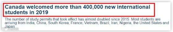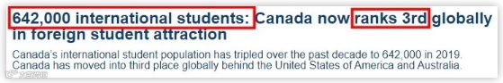 2019年,加拿大国际留学生总人数达到64.2万,跃居全球第三大留学国,仅次于美国和澳大利亚。