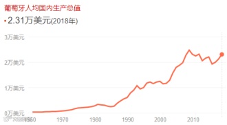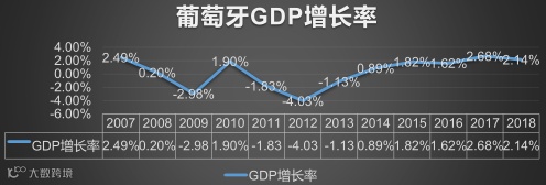 作为一个发达国家,葡萄牙的GDP增长率肯定不会像中国这么快,从下面的图中我们可以看见,葡萄牙的经济增长是非常平缓的,虽然整体的增长幅度不高,但仍然高于欧盟其他国家的平均水平。